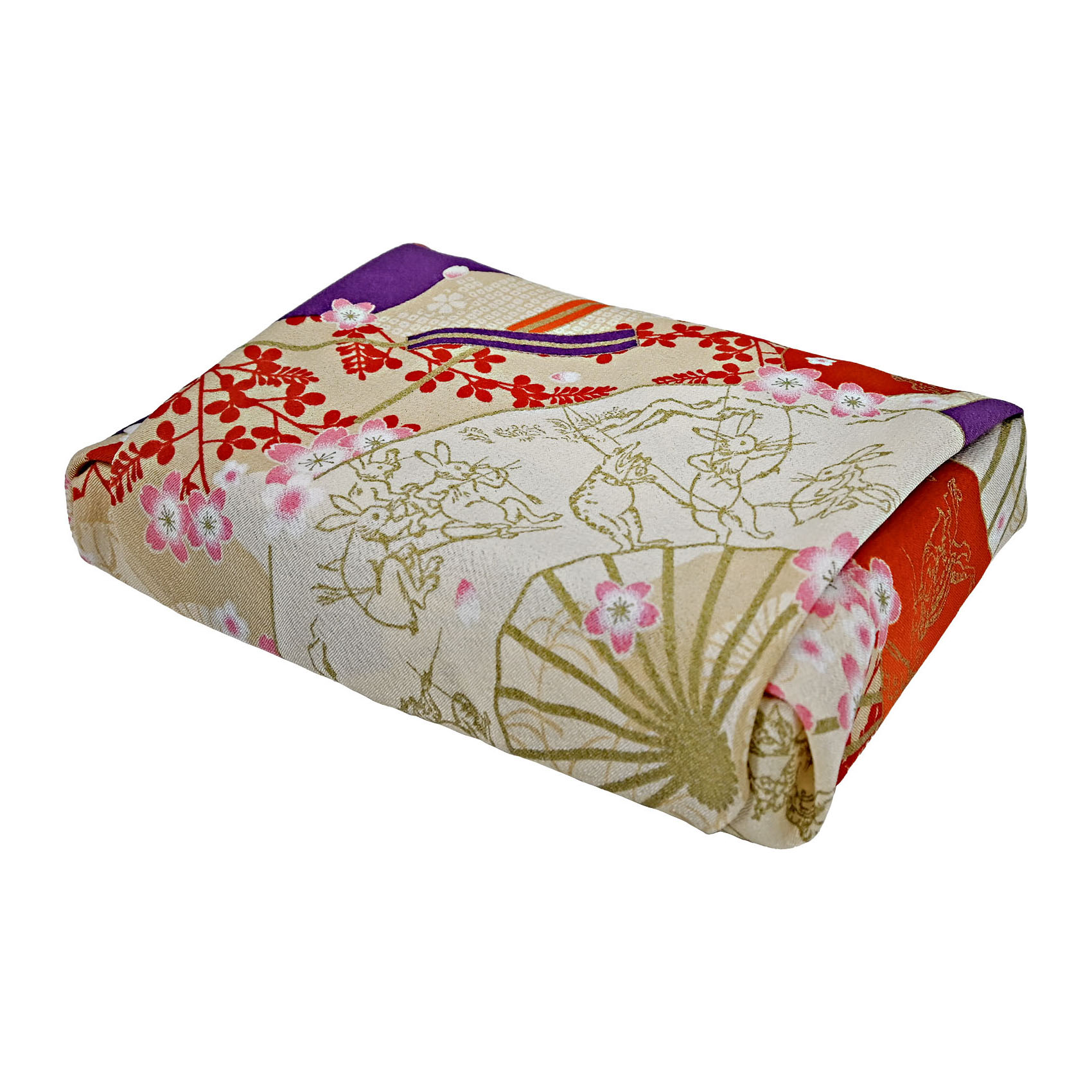風合い豊かなレーヨンちりめんに、鳥獣戯画のユニークな情景をのせた、華やかな和柄のふろしきです。 タペストリーとして飾ったり、もちろん包んでも美しく。日々の暮らしに和のアクセントを添える、飾れるふろしきです。
